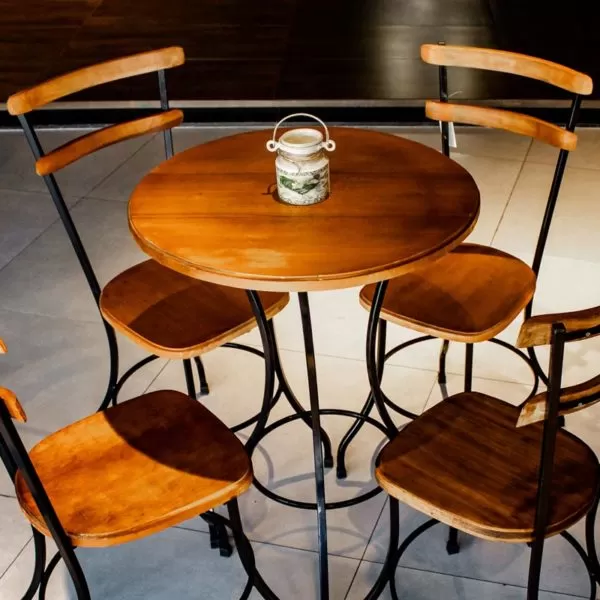 Conjunto mobiliário de ferro e madeira com mesa e banquetas giratórias.